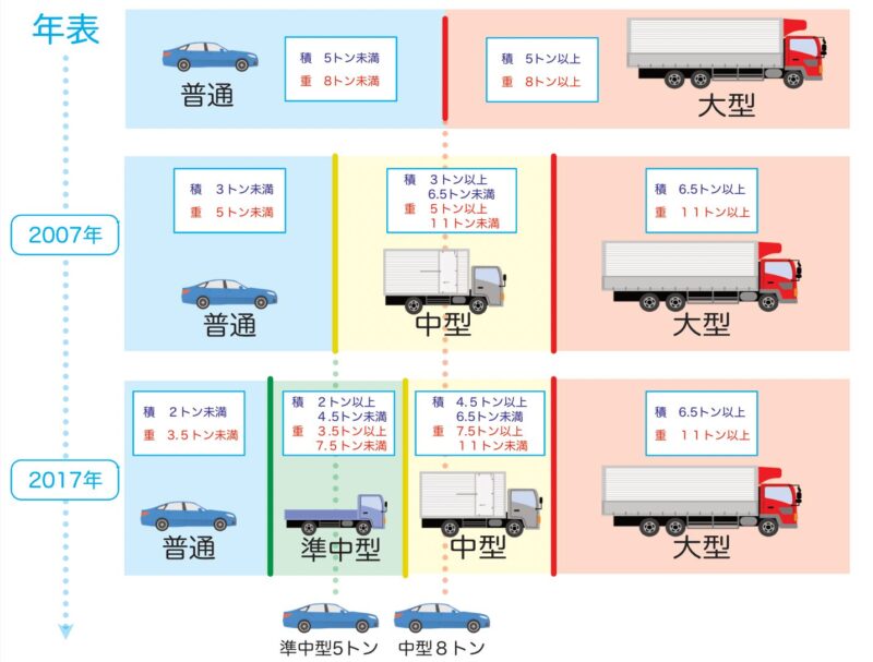 積載2トン未満・総重量3.5トン未満 → 準中型免許が新設され、さらに範囲縮小