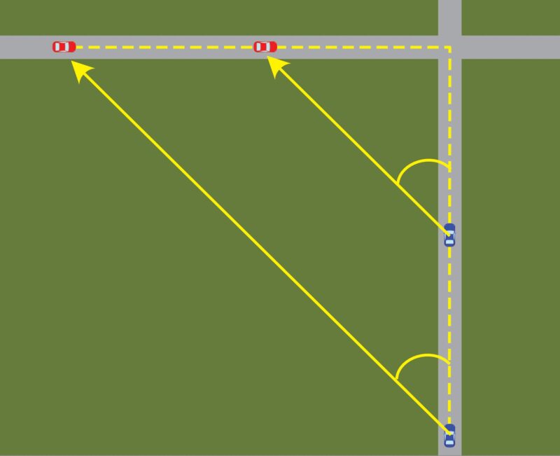 簡単に言えば、互いに衝突コース上にある車は、相手が止まって見える という現象です。