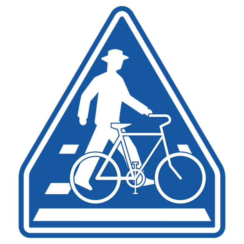 • 横断帯の標識:三角形。横断歩道と自転車横断帯の存在を示す。