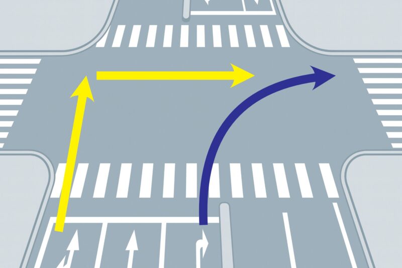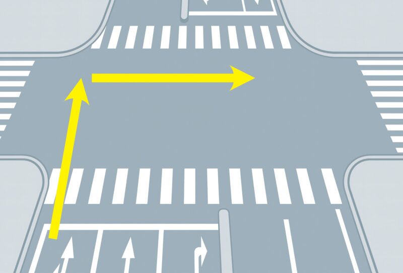 - 二段階右折:交差点を一度直進し、渡り切ってから方向転換して進む。