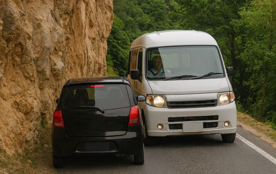 - 後退の判断: どちらかの車が後退しなければならない場合、「待避所や広い場所が近い車」、または**「より安全に後退できる車」**が後退すべきです。