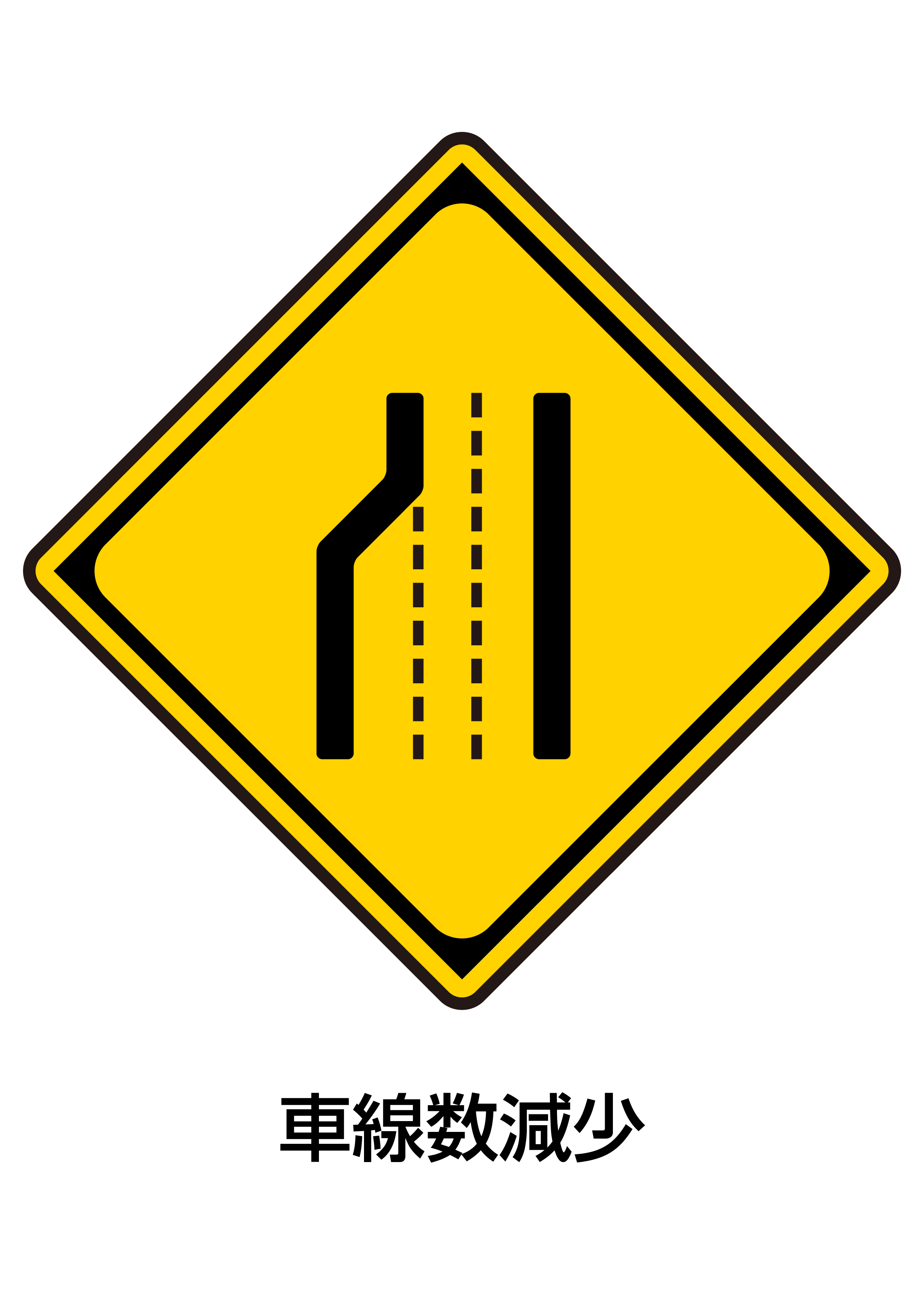 • 車線数減少: 走行している車線(例:2車線)が減り、車線変更が必要になることを示します。この標識を見たら、進路変更の義務が発生します。