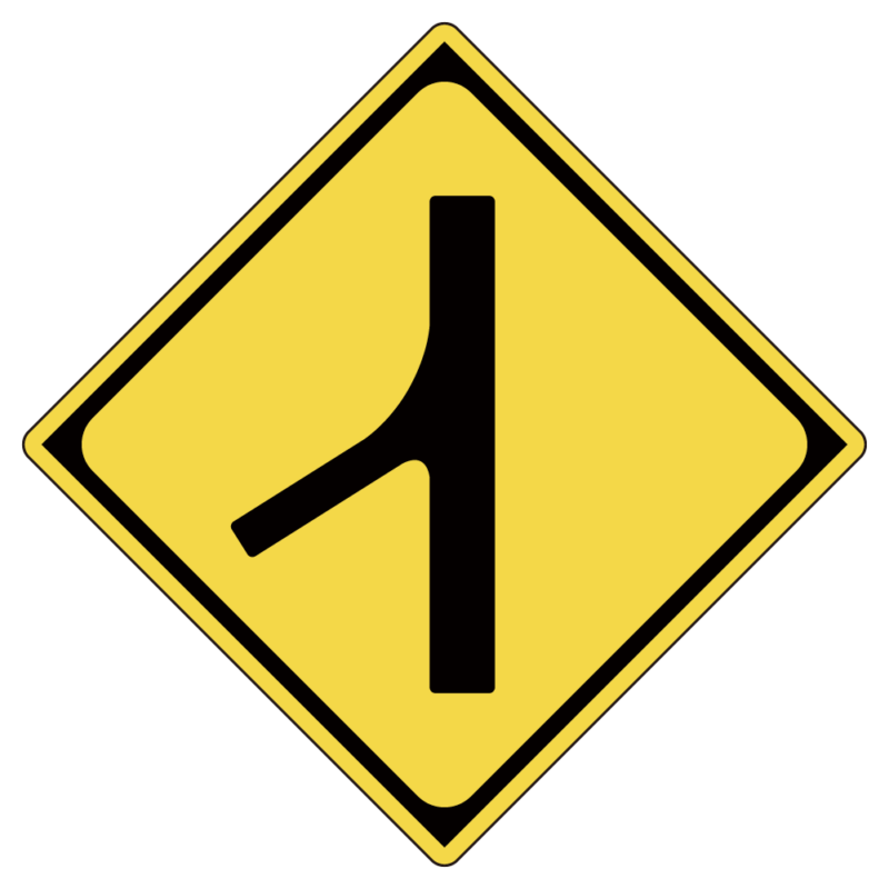 「合流交通あり」の標識は、斜め前から別の道路が本線に合流してくることを示します。