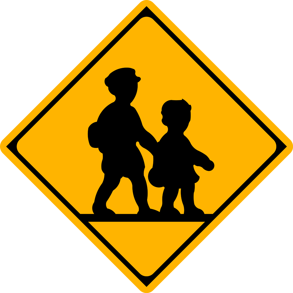 添付の標識は**「学校、幼稚園、保育所など」があることを示すものではなく、「横断歩道あり」**を示します。学校などを警戒する標識は、以下の標識です。