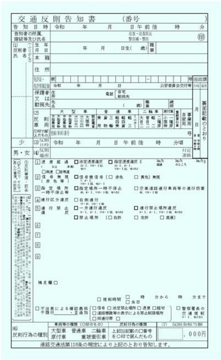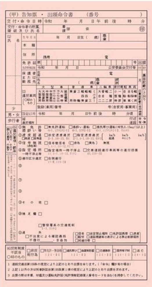 • 対象: 酒酔い運転、酒気帯び運転、妨害運転(あおり運転)などの重大な違反、または青切符の反則金を納めなかった場合。