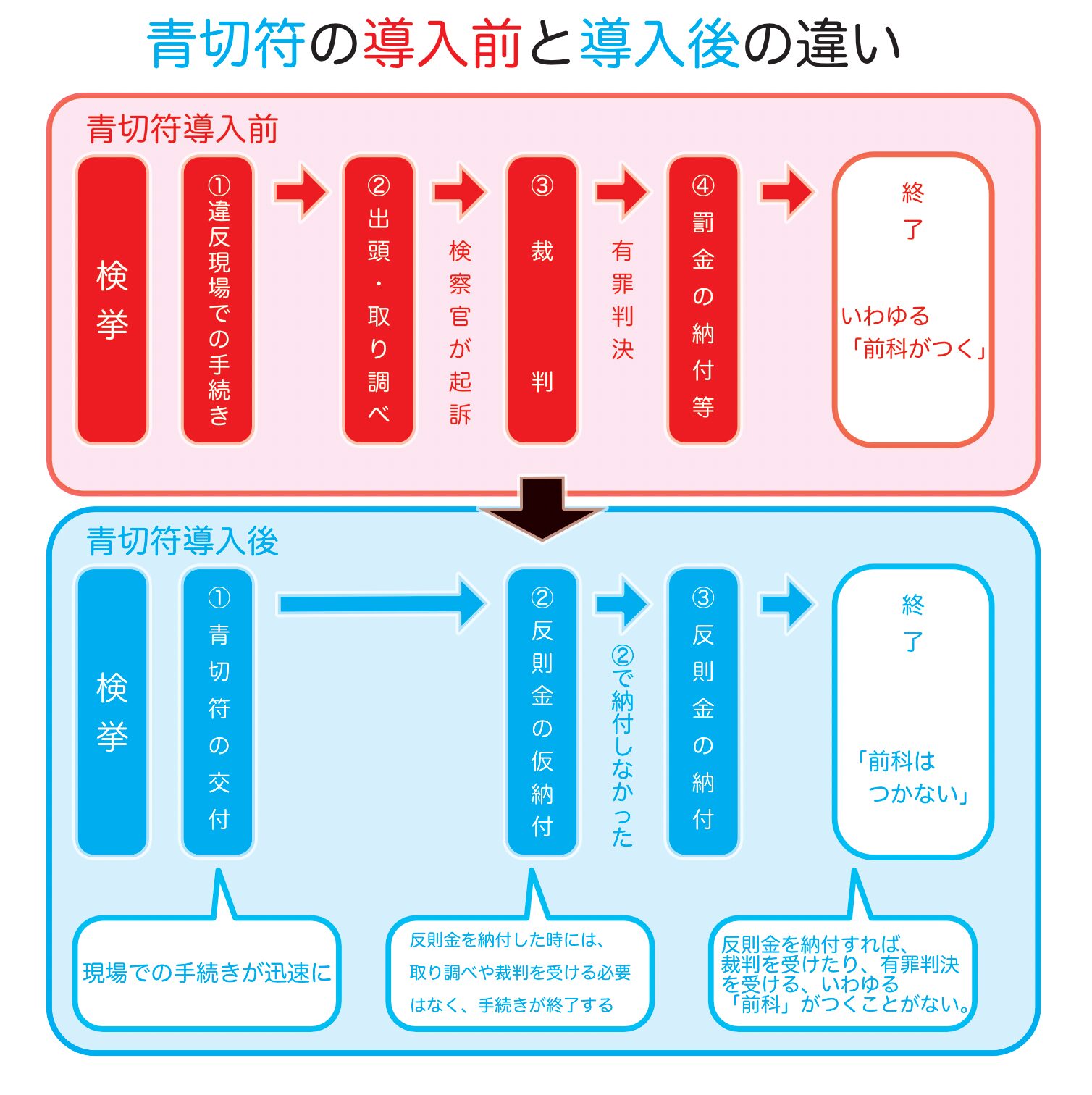 - 検挙 → 青切符交付 → 反則金の納付 → 終了(前科なし)