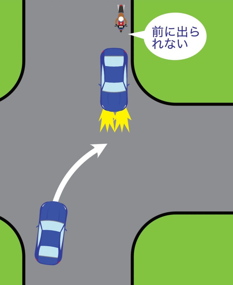- あなたが「壁」になった: 譲ったあなたの車が視界を遮り、右折車からもバイクからも、お互いの姿が見えなくなってしまった。
