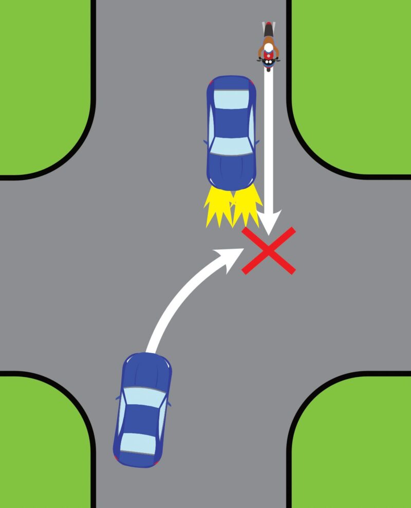あなたが停止し、パッシングや手合図で合図を送る。 相手は「ありがとう!」と右折を開始する。 その瞬間、あなたの車の左側をすり抜けてきたバイクと、右折車が衝突する――。