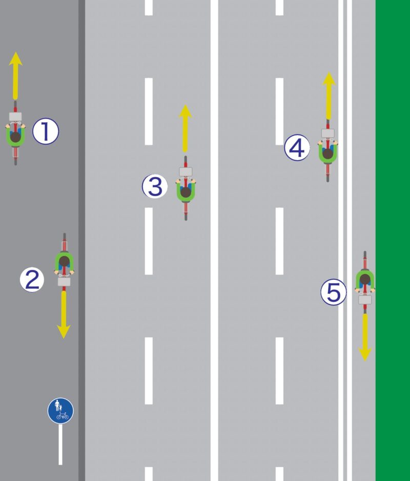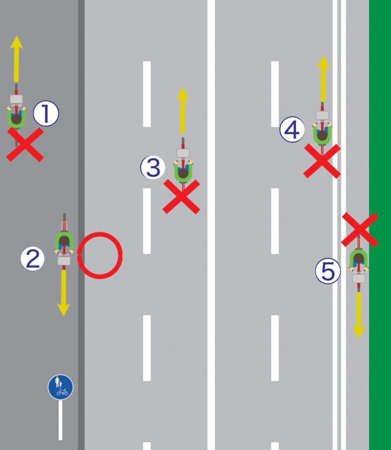 したがって、車線のど真ん中を堂々と走っている③や、車道の右側を逆走している④は極めて危険な違反行為です。特に④のような逆走は、左側を通行してくる自動車や他の自転車と正面衝突する恐れがあります。