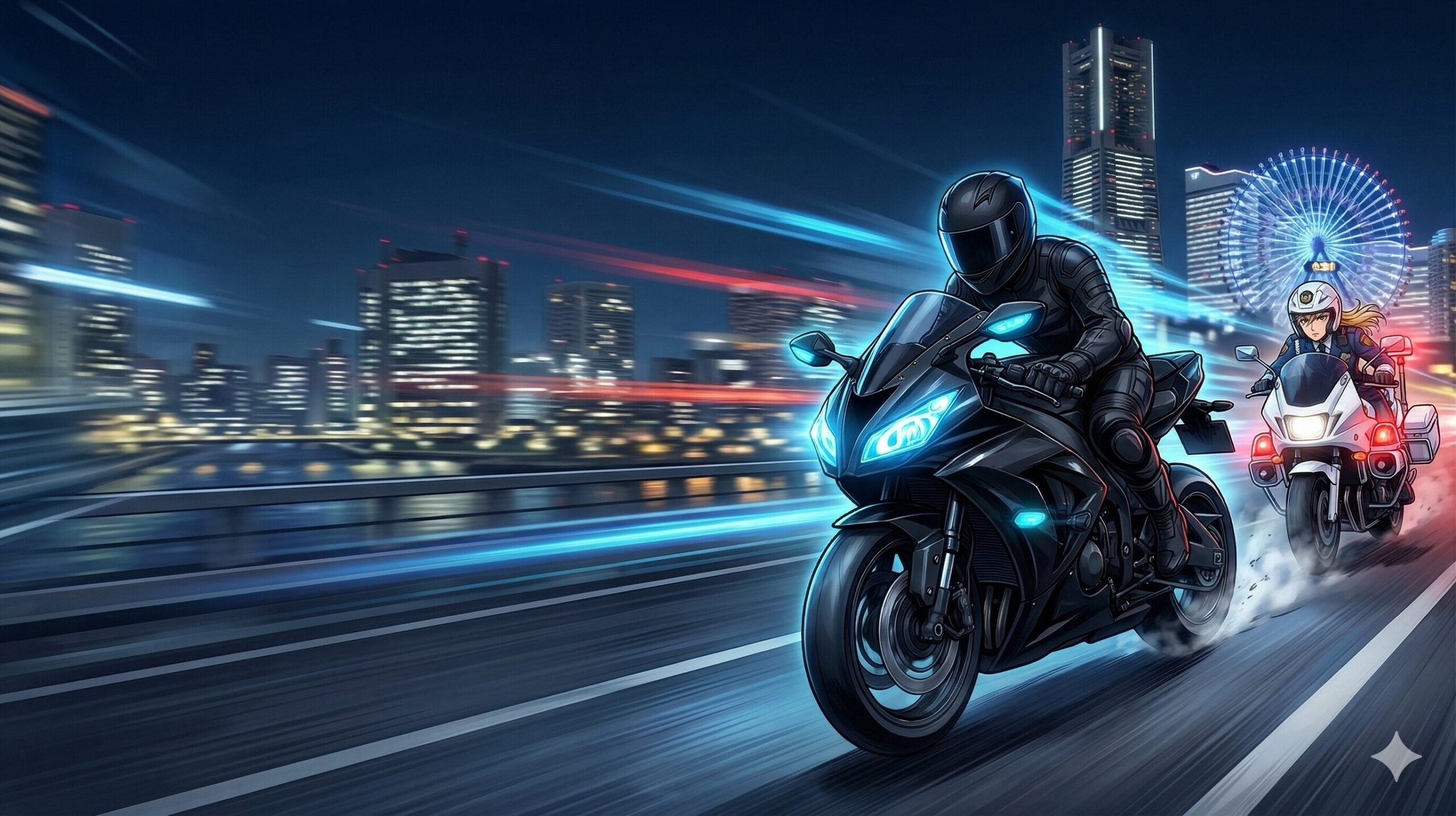 横浜ベイブリッジをはじめ、映画の中には現実の地名や見知った景色が次々と登場します。架空の街ではなく、私たちが普段走っている「あのリアルな街並み」を白バイや謎の黒バイクがとんでもないスピードで駆け抜けていくため、スクリーンへの没入感が凄まじいんです。 「あ、ここ知ってる!」という風景の中で繰り広げられるチェイスシーンは、現実とアニメの境界線が曖昧になるような不思議な興奮がありました。